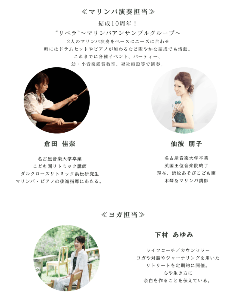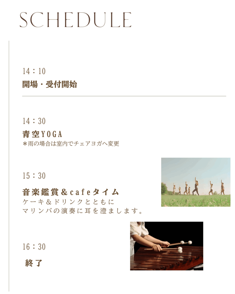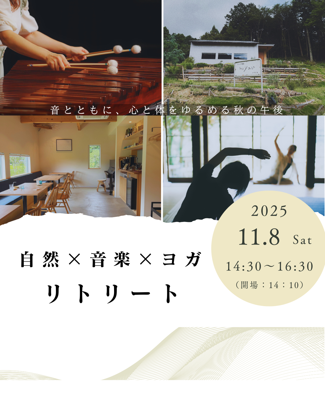 フレンチ食堂&カフェ noyan(ノワイヨ)(静岡県周智郡森町一宮4847-7 *小国神社より5分) 心地よい音を奏でるマリンバの演奏&芝生のお庭で行う青空ヨガで癒しの時間をお届けします。日常をそっと手放して がんばることから少し離れる午後。心と体がふっとゆるむありのままの時間を過ごしませんか? 日時 11月8日(土)14:30~16:30 (*14:10開場&受付開始) 場所 フレンチ食堂&カフェ noyan(ノワイヨ) (静岡県周智郡森町一宮4847-7 *小国神社より5分) 駐車場あり※お友達とご参加の場合,車の乗り合わせにご協力をお願いいたします。 @noyau_mori 定員 14名 参加費 早割価格:5,000円(9月末まで) 通常価格:5,500円*ケーキ&ドリンクセット付*当日現金払い 持ち物について ■ヨガマットをご持参ください。なお、レンタル希望の方はお申込み時にレンタル有にチェック☑をお願いいたします。レンタルは無料です。■更衣室がございませんのでヨガができる動きやすい格好でお越しください。■水分は各自で持参をお願いいたします。 キャンセルについて 開催3日前よりキャンセル料1,000円(カフェ代)がかかりますのでご了承ください。 お申込み方法 下記フォーム入力またはインスタグラムのDMより受け付けております。 @ayumi__shimomura お名前 * ふりがな * メールアドレス * ヨガマットレンタル希望の有無(*レンタル代は無料です。) レンタル有レンタル無 このサイトはreCAPTCHAによって保護されており、Googleのプライバシーポリシーと利用規約が適用されます。 *送信後に自動返信でご入力いただいたメールアドレスにメールが届きますのでご確認ください。 秋のやわらかなひとときをぜひ、ご一緒に